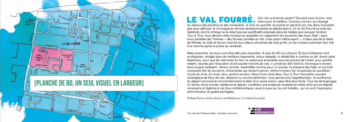 Il faudra plusieurs mois de travail à l’équipe pour recueillir auprès des habitants des centaines d’histoires et d’anecdotes personnelles sur plusieurs décennies de vie dans et au environ des deux tours. Un verbatim illustré par un dessinateur de renom. Mémoire et BD aura ainsi mobilisé un coordinateur de projet, deux journalistes de terrain, un dessinateur, une graphiste et beaucoup d’énergie pour éditer le livre Tour à Tour, de quatre- vingt pages. Lequel est devenu depuis une référence « dans le milieu » des projets culturels autour des rénovations de quartiers.